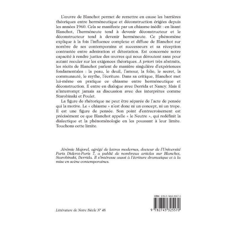 L’œuvre de Blanchot permet de remettre en cause les barrières théoriques entre herméneutique et déconstruction érigées depuis les années 1960. Cela se manifeste par un chiasme inédit : en lisant Blanchot, l’herméneute tend à devenir déconstructeur et le déconstructeur tend à devenir herméneute. Ce phénomène explique à la fois l’influence complexe et diffuse de Blanchot sur nombre de ses contemporains et successeurs et sa réception contrastée entre admiration et détestation. Est concernée notre capacité à rendre justice des œuvres qui nous déroutent sans pour autant reculer sur les exigences théoriques. A priori très abstraits, les récits de Blanchot parlent de manière singulière d’expériences fondamentales : la peau, le deuil, l’amour, la folie, le secret, la communauté, le mythe, l’écriture. Dans sa critique, Blanchot met lui-même en pratique ce chiasme entre herméneutique et déconstruction. Il entre en dialogue avec Derrida et Nancy. Mais il n’interrompt jamais sa discussion avec des interprètes comme Starobinski et Poulet. La figure de rhétorique ne peut être séparée de l’acte de pensée qui la motive. Le « chiasme » n’est donc ni un concept, ni un trope. Il est une figure de pensée. Son point d’entrecroisement est précisément ce que Blanchot appelle « le Neutre », qui redéfinit la dialectique et la phénoménologie en les poussant à leur limite. Touchons cette limite.