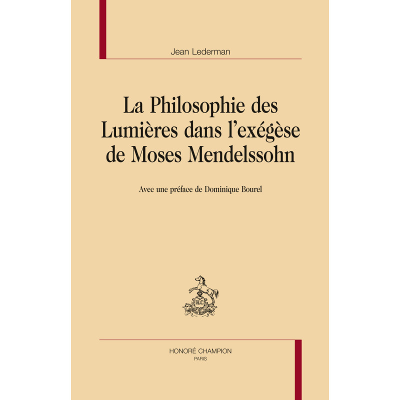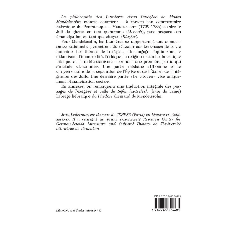 La philosophie des Lumières dans l’exégèse de Moses Mendelssohn montre comment – à travers son commentaire hébraïque du Pentateuque – Mendelssohn (1729-1786) éclaire le Juif du ghetto en tant qu’homme (Mensch), puis prépare son émancipation en tant que citoyen (Bürger). Pour Mendelssohn, les Lumières se rapportent à une connaissance rationnelle permettant de réfléchir sur les choses de la vie humaine. Les thèmes de l’exégèse – le langage, l’optimisme, le didactisme, l’immortalité, l’éthique, la religion naturelle, la critique biblique et l’anti-Messianisme – forment une première partie qui s’intitule « L’homme. » Une partie médiane « L’homme et le citoyen » traite de la séparation de l’Église et de l’État et de l’intégration des Juifs. Une dernière partie « Le citoyen » vise uniquement l’émancipation sociale. En annexes, on remarquera une traduction intégrale des passages de l’exégèse et celle du Séfer ha-Néfesh (livre de l’âme) l’abrégé hébraïque du Phédon allemand de Mendelssohn.