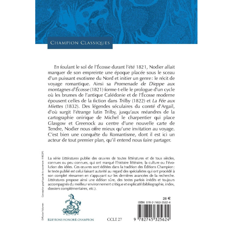 En foulant le sol de l’Écosse durant l’été 1821, Nodier allait marquer de son empreinte une époque placée sous le sceau d’un puissant exotisme du Nord et initier un genre : le récit de voyage romantique. Ainsi sa « Promenade de Dieppe aux montagnes d’Écosse » (1821) forme-t-elle le prologue d’un cycle où les brumes de l’antique Calédonie et de l’Écosse moderne épousent celles de la fiction dans « Trilby » (1822) et « La Fée aux Miettes » (1832). Des légendes séculaires du comté d’Argail, d’où surgit l’étrange lutin Trilby, jusqu’aux méandres de la cartographie onirique de Michel le charpentier qui place Glasgow et Greenock au centre d’une nouvelle carte de Tendre, Nodier nous offre mieux qu’une invitation au voyage. C’est bien une conquête du Romantisme, dont il est ici un acteur de tout premier plan, qu’il entend nous faire partager.
