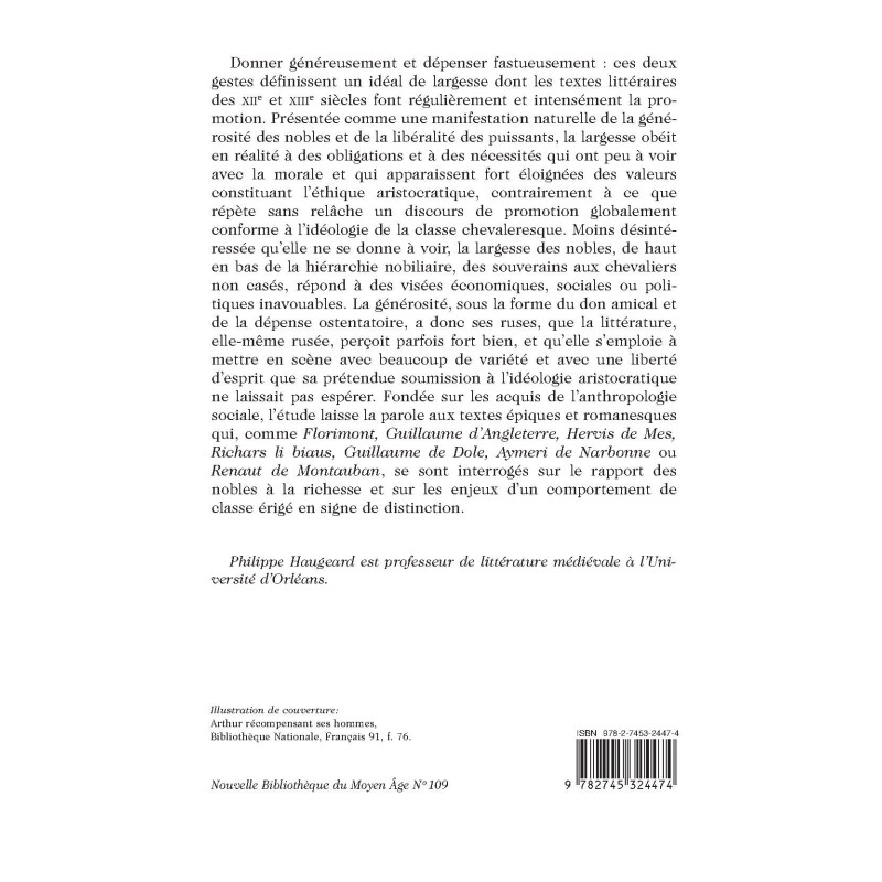 Donner généreusement et dépenser fastueusement : ces deux gestes définissent un idéal de largesse dont les textes littéraires des XIIe et XIIIe siècles font régulièrement et intensément la promotion. Présentée comme une manifestation naturelle de la générosité des nobles et de la libéralité des puissants, la largesse obéit en réalité à des obligations et à des nécessités qui ont peu à voir avec la morale et qui apparaissent fort éloignées des valeurs constituant l’éthique aristocratique, contrairement à ce que répète sans relâche un discours de promotion globalement conforme à l’idéologie de la classe chevaleresque. Moins désintéressée qu’elle ne se donne à voir, la largesse des nobles, de haut en bas de la hiérarchie nobiliaire, des souverains aux chevaliers non casés, répond à des visées économiques, sociales ou politiques inavouables. La générosité, sous la forme du don amical et de la dépense ostentatoire, a donc ses ruses, que la littérature, elle-même rusée, perçoit parfois fort bien, et qu’elle s’emploie à mettre en scène avec beaucoup de variété et avec une liberté d’esprit que sa prétendue soumission à l’idéologie aristocratique ne laissait pas espérer. Fondée sur les acquis de l’anthropologie sociale, l’étude laisse la parole aux textes épiques et romanesques qui, comme « Florimont », « Guillaume d’Angleterre », « Hervis de Mes », « Richars li biaus », « Guillaume de Dole », « Aymeri de Narbonne » ou « Renaut de Montauban », se sont interrogés sur le rapport des nobles à la richesse et sur les enjeux d’un comportement de classe érigé en signe de distinction.