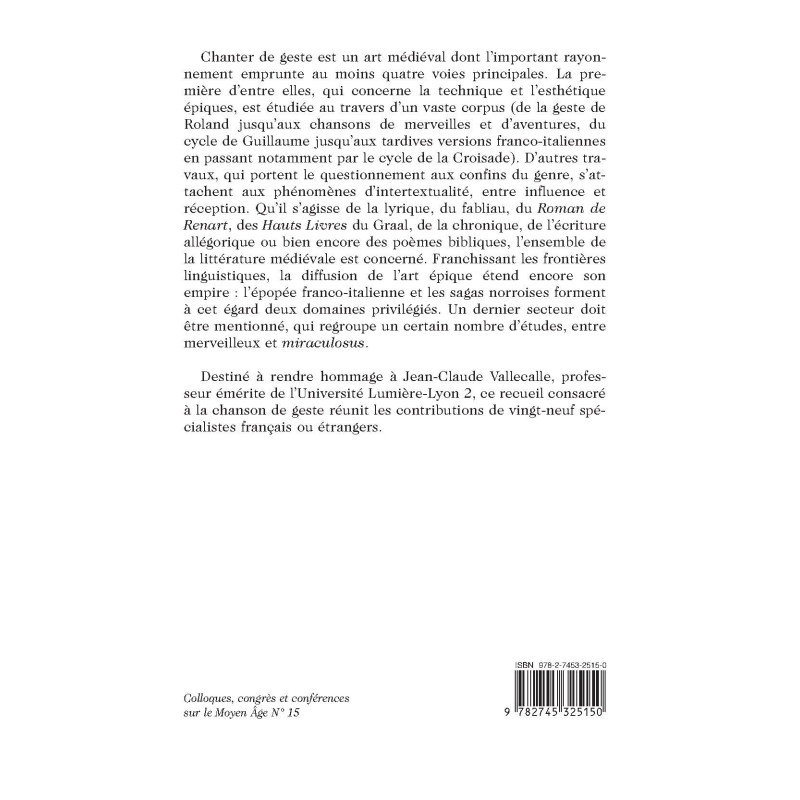Destiné à rendre hommage à Jean-Claude Vallecalle, professeur émérite de l’Université Lumière-Lyon 2, ce recueil consacré à la chanson de geste réunit les contributions de vingt-neuf spécialistes français ou étrangers.