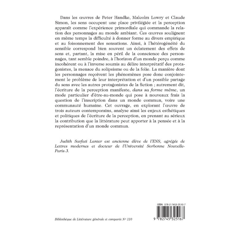 Dans les œuvres de Peter Handke, Malcolm Lowry et Claude Simon, les sens occupent une place privilégiée et la perception apparaît comme l’expérience primordiale qui commande la relation des personnages au monde ambiant. Ces œuvres soulignent en même temps la difficulté à donner forme au divers empirique et au foisonnement des sensations. Ainsi, à l’hétérogénéité du sensible correspond bien souvent un éclatement des effets de sens et, partant, la mise en péril de la conscience des personnages, tant semble poindre, à l’horizon d’un monde perçu comme incohérent ou à l’inverse soumis au délire interprétatif des protagonistes, la menace du solipsisme ou de la folie. La manière dont les personnages reçoivent les phénomènes pose donc conjointement le problème de leur interprétation et d’un possible partage du sens avec les autres protagonistes de la fiction ; autrement dit, l’écriture de la perception manifeste, dans sa forme même, un mode particulier d’être-au-monde qui pose à nouveaux frais la question de l’inscription dans un monde commun, voire une communauté humaine. Cet ouvrage, en explorant l’œuvre de trois auteurs contemporains, analyse ainsi les enjeux esthétiques et politiques de l’écriture de la perception, en prenant au sérieux la contribution que la littérature peut apporter à la pensée et à la représentation d’un monde commun.