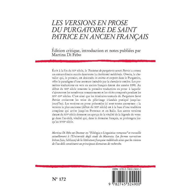 Écrit à la fin du XIIe siècle, le « Tractatus de purgatorio sancti Patrici » a connu un extraordinaire succès dans toute la chrétienté médiévale. Owein, le chevalier qui, le premier, est descendu in anima et corpore dans le Purgatoire, offre le paradigme d’une aventure imitable par la chevalerie entière. Les premières traductions en vers en ancien français datent des années 1190. Au début du XIIIe siècle remonte la première traduction en prose à laquelle s’ajouteront les nombreux remaniements et les récits composés pendant les XIVe -XVe siècles. C’est ainsi que les itinéraires textuels du « Purgatoire Saint Patrice » croiseront les voies du pèlerinage irlandais pratiqué jusqu’aujourd’hui. Les versions en prose présentées ici sont toutes anonymes : la version la plus ancienne (début du XIIIe siècle) est à la base d’une tradition complexe qui arrive jusqu’en Provence et en Italie. Les autres versions datant du XIVe siècle donnent un aperçu de la vitalité de la légende du voyage dans l’au-delà, vitalité qui, dans le domaine français, se prolongera jusqu’au XVIIIe siècle.