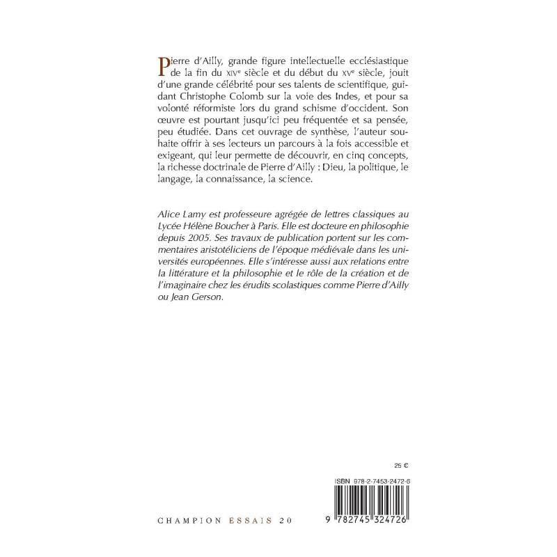 Pierre d’Ailly, grande figure intellectuelle ecclésiastique de la fin du XIVe siècle et du début du XVe siècle, jouit d’une grande célébrité pour ses talents de scientifique, guidant Christophe Colomb sur la voie des Indes, et pour sa volonté réformiste lors du grand schisme d’occident. Son œuvre est pourtant jusqu’ici peu fréquentée et sa pensée, peu étudiée. Dans cet ouvrage de synthèse, l’auteur souhaite offrir à ses lecteurs un parcours à la fois accessible et exigeant, qui leur permette de découvrir, en cinq concepts, la richesse doctrinale de Pierre d’Ailly : Dieu, la politique, le langage, la connaissance, la science.
