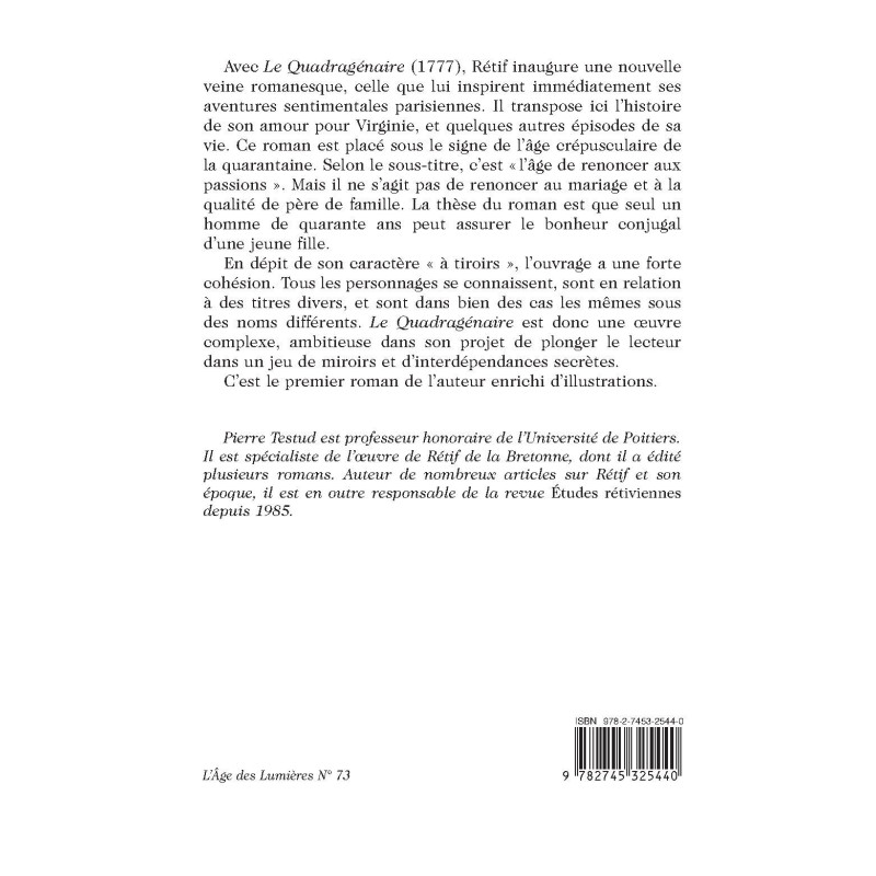 Pierre Testud est professeur honoraire de l’Université de Poitiers. Il est spécialiste de l’œuvre de Rétif de la Bretonne, dont il a édité plusieurs romans. Auteur de nombreux articles sur Rétif et son époque, il est en outre responsable de la revue « Études rétiviennes » depuis 1985.