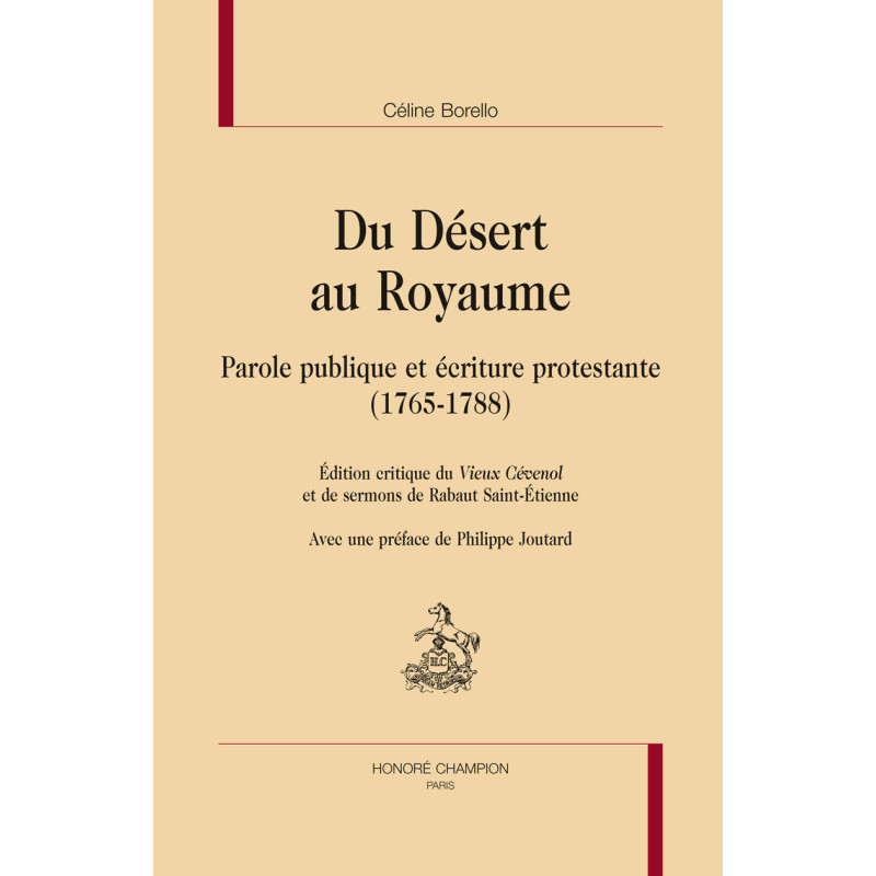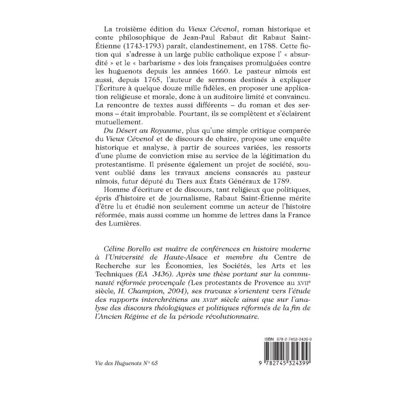 La troisième édition du « Vieux Cévenol », roman historique et conte philosophique de Jean-Paul Rabaut dit Rabaut Saint-Étienne (1743-1793) paraît, clandestinement, en 1788. Cette fiction qui s’adresse à un large public catholique expose l’ « absurdité » et le « barbarisme » des lois françaises promulguées contre les huguenots depuis les années 1660. Le pasteur nîmois est aussi, depuis 1765, l’auteur de sermons destinés à expliquer l’Écriture à quelque douze mille fidèles, en proposer une application religieuse et morale, donc à un auditoire limité et convaincu. La rencontre de textes aussi différents – du roman et des sermons – était improbable. Pourtant, ils se complètent et s’éclairent mutuellement. « Du Désert au Royaume », plus qu’une simple critique comparée du « Vieux Cévenol » et de discours de chaire, propose une enquête historique et analyse, à partir de sources variées, les ressorts d’une plume de conviction mise au service de la légitimation du protestantisme. Il présente également un projet de société, souvent oublié dans les travaux anciens consacrés au pasteur nîmois, futur député du Tiers aux États Généraux de 1789. Homme d’écriture et de discours, tant religieux que politiques, épris d’histoire et de journalisme, Rabaut Saint-Étienne mérite d’être lu et étudié non seulement comme un acteur de l’histoire réformée, mais aussi comme un homme de lettres dans la France des Lumières.