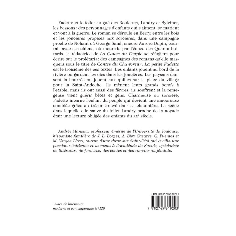 Fadette et le follet au gué des Roulettes, Landry et Sylvinet, les bessons : des personnages d’enfants qui s’aiment, se marient et vont à la guerre. Le roman se déroule en Berry, entre les bois et les joncières propices aux sorcières, dans une campagne proche de Nohant où George Sand, encore Aurore Dupin, courrait avec ses chiens, où meurtrie par l’échec des Quaranthuitards, la rédactrice de « La Cause du Peuple » se réfugiera pour écrire sur le prolétariat des campagnes des romans qu’elle masquera sous le titre de « Contes du Chanvreur : La petite Fadette » est le troisième des ces textes. Les enfants jouent au bord de la rivière ou gardent les oies dans les joncières. Les paysans dansent la bourrée ou jouent aux quilles sur la place du village pour la Saint-Andoche. Ils mènent leurs grands bœufs à l’étable, mais ils ont aussi des fièvres, ils souffrent et la remégeuse vient guérir bêtes et gens. Charmeuse ou sorcière, Fadette incarne l’enfant du peuple qui devient une amoureuse comblée grâce au trésor trouvé dans sa chaumière. La scène dans laquelle elle sauve du follet Landry proche de la noyade était une lecture obligée des enfants du XXe siècle.