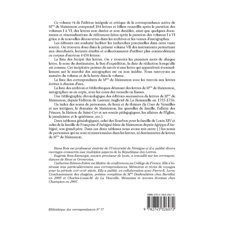 Ce volume VII de l’édition intégrale et critique de la correspondance active de Mme de Maintenon comprend 184 lettres et billets recueillis après la parution des volumes I à VI, des lettres non datées et non datables, ainsi que quelques documents et réactualisations de références faites après la parution des volumes I à VI grâce à de nouvelles découvertes dans les archives et les ventes d’autographes. Les éditeurs ont souhaité faciliter les recherches ponctuelles dans cette vaste source. On trouvera donc dans le présent volume VII des instruments permettant aux chercheurs, lecteurs érudits et collectionneurs d’utiliser plus commodément ce corpus d’environ 4450 lettres: La liste des « Incipit » des lettres. On y trouvera les premiers mots de chaque lettre, le nom du destinataire, le lieu d’expédition, la date de rédaction lorsqu’elle est connue. Cet incipitaire permet de savoir si une lettre qui apparaîtrait éventuellement sur le marché des autographes est ou non inédite. Nous renvoyons au numéro du volume et de la lettre dans le volume. La liste des correspondants de Mme de Maintenon avec les renvois aux lettres écrites à chacun d’eux. La liste des archives et bibliothèques détenant des lettres de Mme de Maintenon, autographes ou en copie, avec les cotes des recueils ou liasses. Une bibliographie chronologique des éditions successives de lettres de Mme de Maintenon, depuis l’édition de Laurent Angliviel de La Beaumelle en 1755-1756. Un index des noms de personnes, de lieux et de thèmes. Deux tableaux généalogiques, celui des Bourbon pour la famille de Louis XIV et celui de la famille de Françoise d’Aubigné-Mme de Maintenon depuis Agrippa d’Aubigné, son grand-père. Dans ces deux tableaux nous avons mis entre { } les noms de personnes qui ne sont ni mentionnées dans les les lettres, ni destinataires de lettres de Mme de Maintenon.