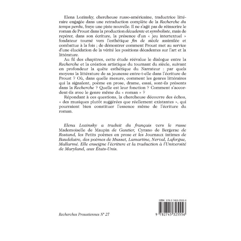 Elena Lozinsky, chercheuse russo-américaine, traductrice littéraire engagée dans une retraduction complète de la « Recherche du temps perdu », fraye une piste nouvelle. Il ne s’agit pas de réinscrire le roman de Proust dans la production « décadent »e et « symboliste », mais de repérer, dans son écriture, la présence d’un « jeu intertextuel » fondateur tourné vers l’esthétique « fin de siècle » assimilée et combattue à la fois ; de démontrer comment Proust met au service d’une élucidation de la vérité les positions décadentes sur l’art et la littérature. Au fil des chapitres, cette étude réévalue le dialogue entre la « Recherche » et la création artistique du tournant du siècle, suivant en profondeur la quête esthétique du Narrateur : par quels moyens la littérature de sa jeunesse entre-t-elle dans l’écriture de Proust ? Où, dans quelle mesure, comment les genres littéraires qui la signalent, poème en prose, drame, essai, sont-ils présents dans la « Recherche » ? Quelle est leur fonction ? Comment s’accordent-ils avec le genre même du « roman » ? Répondant à ces questions, la chercheuse découvre des échos, « des musiques plutôt suggérées que réellement existantes », qui pourraient bien constituer l’essence même de l’écriture du roman.