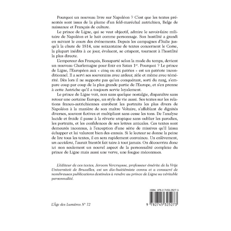 Pourquoi un nouveau livre sur Napoléon ? C’est que les textes présentés sont issus de la plume d’un feld-maréchal autrichien, Belge de naissance et Français de culture. Le prince de Ligne, qui se veut objectif, admire le savoir-faire militaire de Napoléon et le hait comme personnage. Son hostilité a grandi en suivant le cours des événements. Depuis les campagnes d’Italie jusqu’à la chute de 1814, une soixantaine de textes concernent le Corse, la plupart inédits à ce jour, évoluent, se crispent, tournent à l’hostilité la plus directe. L’empereur des Français, Bonaparté selon la mode du temps, devient un nouveau Charlemagne pour finir en Satan Ier. Pourquoi ? Le prince de Ligne, l’Européen aux « cinq ou six patries » est un patriote inconditionnel. Il a servi ses souverains avec ardeur, zèle et même avec témérité. Dès lors il ne supporte pas qu’un conquérant, sorti du rang, s’empare coup par coup de la plus grande partie de l’Europe, et s’en prenne à cette Autriche qu’il a toujours servie loyalement. Le prince de Ligne voit, non sans quelque nostalgie disparaître sans retour une certaine Europe, un style de vie aussi. Ses textes sur les relations franco-autrichiennes enrobent les portraits les plus divers de Napoléon à la manière de son maître Voltaire, s’affublant de dignités diverses, souvent fictives et multipliant sans cesse les tons. De l’analyse lucide et froide il passe à la rêverie utopique sans oublier les parodies, les portraits, et les confidences de ses lettres amicales. Ces textes sont demeurés inconnus, à l’exception d’une série de missives qu’il laissa échapper et lui valurent bien des ennuis. Si le lecteur se donne la peine de lire tous les textes, il en sera rapidement convaincu. Un enlèvement, un accident, l’aurait bientôt fait taire à tout jamais. On découvrira donc ici non seulement un nouvel aspect de la personnalité complexe du prince de Ligne mais aussi une verve, une fougue méconnues.