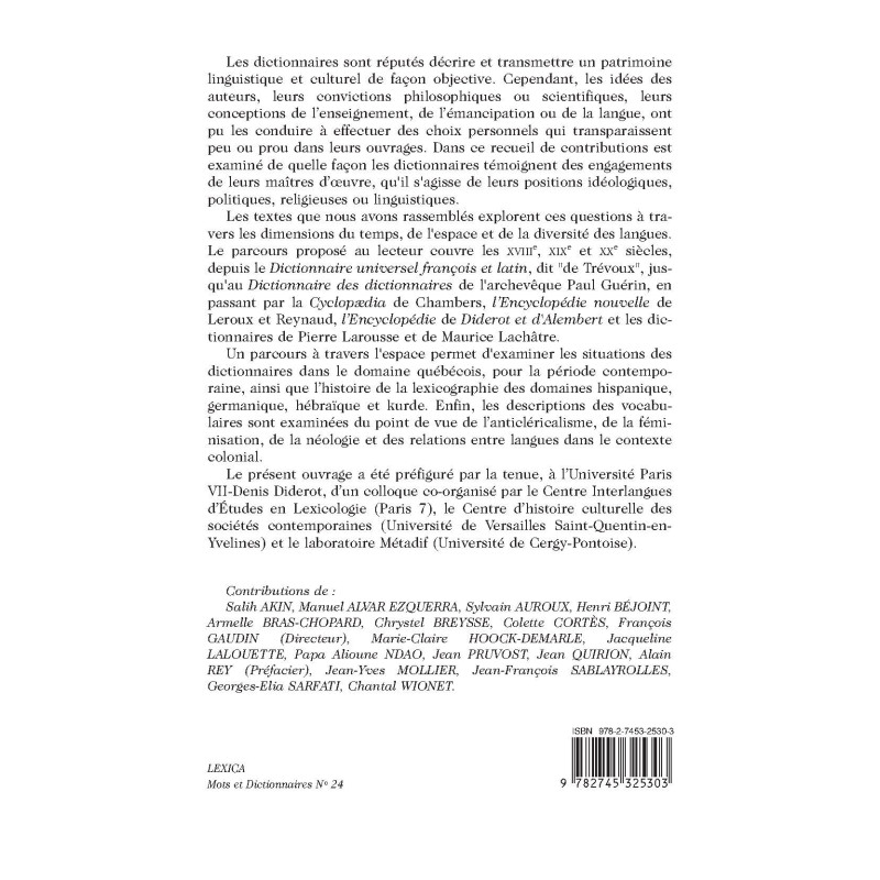 Les dictionnaires sont réputés décrire et transmettre un patrimoine linguistique et culturel de façon objective. Cependant, les idées des auteurs, leurs convictions philosophiques ou scientifiques, leurs conceptions de l’enseignement, de l’émancipation ou de la langue ont pu les conduire à effectuer des choix personnels qui transparaissent peu ou prou dans leurs ouvrages. Dans ce recueil de contributions est examiné de quelle façon les dictionnaires témoignent des engagements de leurs maîtres d’oeuvre, qu`il s`agisse de leurs positions idéologiques, politiques, religieuses ou linguistiques. Les textes que nous avons rassemblés explorent ces questions à travers les dimensions du temps, de l`espace et de la diversité des langues. Le parcours proposé au lecteur couvre les XVIIIe, XIXe et XXe siècles, depuis le « Dictionnaire universel françois et latin », dit "de Trévoux", jusqu`au « Dictionnaire des dictionnaires » de l`archevêque Paul Guérin, en passant par la « Cyclopædia » de Chambers, « l’Encyclopédie nouvelle » de Leroux et Reynaud, « l’Encyclopédie » de « Diderot et d`Alembert » et les dictionnaires de Pierre Larousse et de Maurice Lachâtre. Un parcours à travers l`espace permet d`examiner les situations des dictionnaires dans le domaine québécois, pour la période contemporaine, ainsi que l’histoire de la lexicographie des domaines hispanique, germanique, hébraïque et kurde. Enfin, les descriptions des vocabulaires sont examinées du point de vue de l’anticléricalisme, de la féminisation, de la néologie et des relations entre langues dans le contexte colonial. Le présent ouvrage a été préfiguré par la tenue, à l’Université Paris VII-Denis Diderot, d’un colloque co-organisé par le Centre Interlangues d’Études en Lexicologie (Paris 7), le Centre d’histoire culturelle des sociétés contemporaines (Université de Versailles Saint-Quentin-en-Yvelines) et le laboratoire Métadif (Université de Cergy-Pontoise).