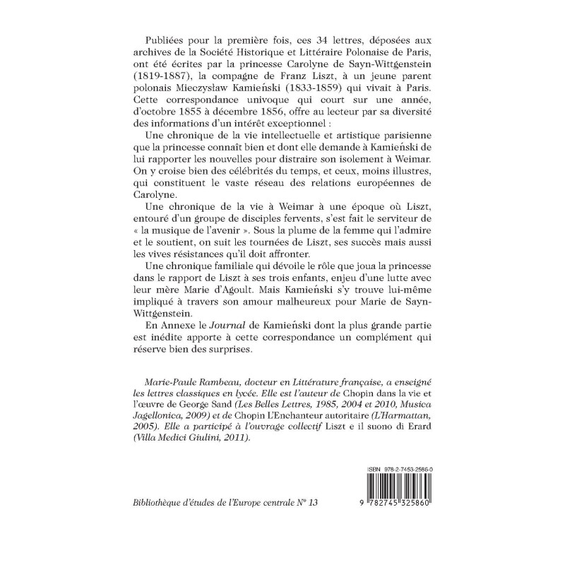 Publiées pour la première fois, ces 34 lettres, déposées aux archives de la Société Historique et Littéraire Polonaise de Paris, ont été écrites par la princesse Carolyne de Sayn- Wittgenstein (1819-1887), la compagne de Franz Liszt, à un jeune parent polonais Mieczyslaw Kamienski (1833-1859) qui vivait à Paris. Cette correspondance univoque qui court sur une année, d’octobre 1855 à décembre 1856, offre au lecteur par sa diversité des informations d’un intérêt exceptionnel : Une chronique de la vie intellectuelle et artistique parisienne que la princesse connaît bien et dont elle demande à Kamienski de lui rapporter les nouvelles pour distraire son isolement à Weimar. On y croise bien des célébrités du temps, et ceux, moins illustres, qui constituent le vaste réseau des relations européennes de Carolyne. Une chronique de la vie à Weimar à une époque où Liszt, entouré d’un groupe de disciples fervents, s’est fait le serviteur de « la musique de l’avenir ». Sous la plume de la femme qui l’admire et le soutient, on suit les tournées de Liszt, ses succès mais aussi les vives résistances qu’il doit affronter. Une chronique familiale qui dévoile le rôle que joua la princesse dans le rapport de Liszt à ses trois enfants, enjeu d’une lutte avec leur mère Marie d’Agoult. Mais Kamienski s’y trouve lui-même impliqué à travers son amour malheureux pour Marie de Sayn-Wittgenstein. En Annexe le Journal de Kamienski dont la plus grande partie est inédite apporte à cette correspondance un complément qui réserve bien des surprises.