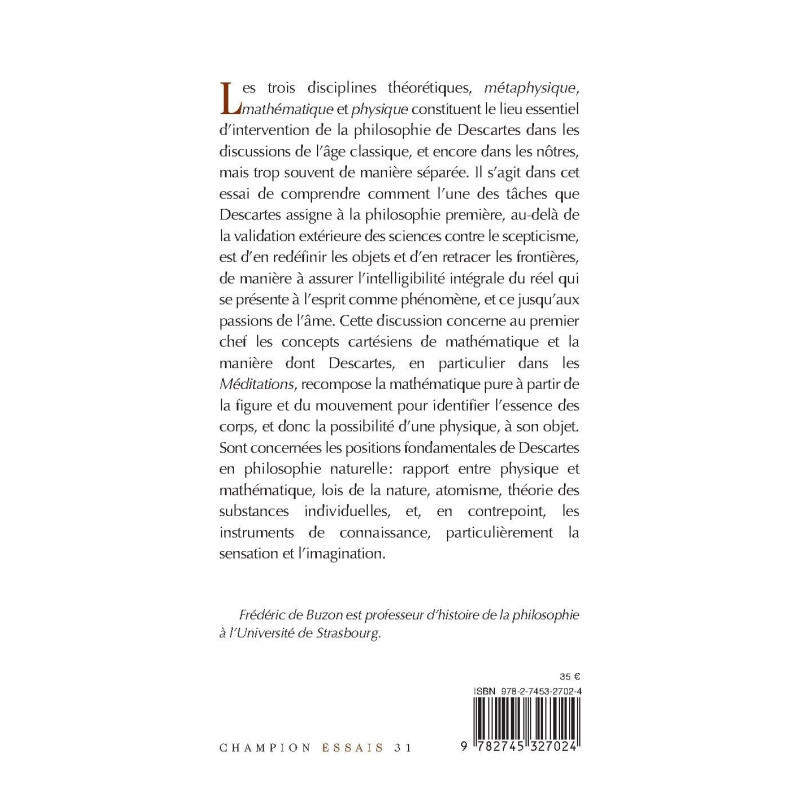 Les trois disciplines théorétiques, « métaphysique », « mathématique » et « physique » constituent le lieu essentiel d’intervention de la philosophie de Descartes dans les discussions de l’âge classique, et encore dans les nôtres, mais trop souvent de manière séparée. Il s’agit dans cet essai de comprendre comment l’une des tâches que Descartes assigne à la philosophie première, au delà de la validation extérieure des sciences contre le scepticisme, est d’en redéfinir les objets et d’en retracer les frontières, de manière à assurer l’intelligibilité intégrale du réel qui se présente à l’esprit comme phénomène, et ce jusqu’aux passions de l’âme. Cette discussion concerne au premier chef les concepts cartésiens de mathématique et la manière dont Descartes, en particulier dans les « Méditations », recompose la mathématique pure à partir de la figure et du mouvement pour identifier l’essence des corps, et donc la possibilité d’une physique, à son objet. Sont concernées les positions fondamentales de Descartes en philosophie naturelle: rapport entre physique et mathématique, lois de la nature, atomisme, théorie des substances individuelles, et, en contrepoint, les instruments de connaissance, particulièrement la sensation et l’imagination.