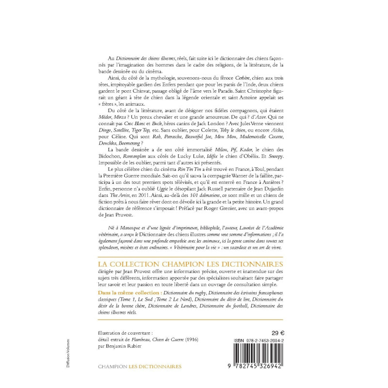 Au « Dictionnaire des chiens illustres », réels, fait suite ici le dictionnaire des chiens façonnés par l’imagination des hommes dans le cadre des religions, de la littérature, de la bande dessinée ou du cinéma.