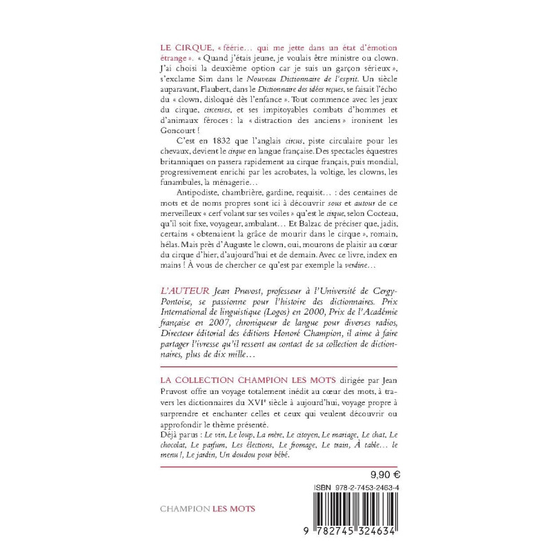 LE CIRQUE, « féérie… qui me jette dans un état d’émotion étrange ». « Quand j’étais jeune, je voulais être ministre ou clown. J’ai choisi la deuxième option car je suis un garçon sérieux », s’exclame Sim dans le « Nouveau Dictionnaire de l’esprit ». Un siècle auparavant, Flaubert, dans le « Dictionnaire des idées reçues », se faisait l’écho du « clown, disloqué dès l’enfance ». Tout commence avec les jeux du cirque, « circenses », et ses impitoyables combats d’hommes et d’animaux féroces : la « distraction des anciens » ironisent les Goncourt ! C’est en 1832 que l’anglais « circus », piste circulaire pour les chevaux, devient le « cirque » en langue française. Des spectacles équestres britanniques on passera rapidement au cirque français, puis mondial, progressivement enrichi par les acrobates, la voltige, les clowns, les funambules, la ménagerie… Antipodiste, chambrière, gardine, requisit… : des centaines de mots et de noms propres sont ici à découvrir « sous » et « autour » de ce merveilleux « cerf volant sur ses voiles » qu’est le « cirque », selon Cocteau, qu’il soit fixe, voyageur, ambulant… Et Balzac de préciser que, jadis, certains « obtenaient la grâce de mourir dans le cirque », romain, hélas. Mais près d’Auguste le clown, oui, mourons de plaisir au cœur du cirque d’hier, d’aujourd’hui et de demain. Avec ce livre, index en mains ! À vous de chercher ce qu’est par exemple la « verdine »…