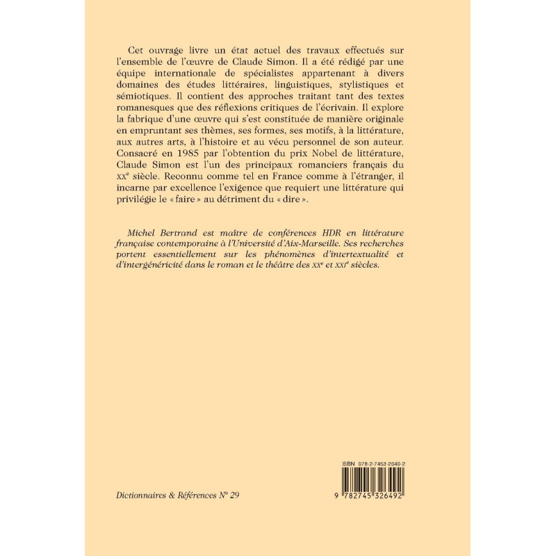 Cet ouvrage livre un état actuel des travaux effectués sur l’ensemble de l’œuvre de Claude Simon. Il a été rédigé par une équipe internationale de spécialistes appartenant à divers domaines des études littéraires, linguistiques, stylistiques et sémiotiques. Il contient des approches traitant tant des textes romanesques que des réflexions critiques de l’écrivain. Il explore la fabrique d’une œuvre qui s’est constituée de manière originale en empruntant ses thèmes, ses formes, ses motifs, à la littérature, aux autres arts, à l’histoire et au vécu personnel de son auteur. Consacré en 1985 par l’obtention du prix Nobel de littérature, Claude Simon est l’un des principaux romanciers français du XXe siècle. Reconnu comme tel en France comme à l’étranger, il incarne par excellence l’exigence que requiert une littérature qui privilégie le « faire » au détriment du «dire ».
