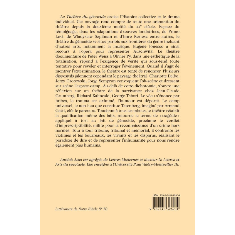 « Le Théâtre du génocide » croise l’Histoire collective et le drame individuel. Cet ouvrage rend compte de toute une orientation du théâtre depuis la deuxième moitié du XXe siècle. Espace du témoignage, dans les adaptations d’œuvres fondatrices, de Primo Levi, de Wladyslaw Szpilman et d’Imre Kertesz entre autres, le théâtre du génocide se situe parfois aux frontières du genre incluant d’autres arts, notamment la musique. Eugène Ionesco a ainsi recours à l’opéra pour représenter Auschwitz. Le théâtre documentaire de Peter Weiss à Olivier Py, dans une esthétique de la totalisation, répond à l’exigence de vérité qui sous-tend toute tentative pour révéler et interroger l’événement. Quand il s’agit de montrer l’extermination, le théâtre est tenté de renoncer. Plusieurs dispositifs jalonnent cependant le paysage théâtral : Charlotte Delbo, Jerzy Grotowski, Jorge Semprun convoquent l’ob-scène et dressent sur scène l’espace-camp. Au-delà de cette dichotomie, s’ouvre une réflexion sur un théâtre de la survivance chez Jean-Claude Grumberg, Richard Kalinoski, George Tabori. Le vécu s’énonce par bribes, le trauma est exhumé, l’humour est déporté. Le camp universel, le non-lieu que constitue Tatenberg, imaginé par Armand Gatti, clôt le parcours. Touchant à tous les tabous, le théâtre rétablit la qualification même des faits, retourne le terme de « tragédie» appliqué à tort au fait de génocide, proclame le verdict d’imprescriptibilité, milite pour la reconnaissance d’un crime hors normes. Tour à tour tribune, tribunal et mémorial, il confronte les victimes et les bourreaux, les vivants et les disparus, réalisant le paradoxe de dire et de représenter l’inhumanité pour nous rendre également plus humains.