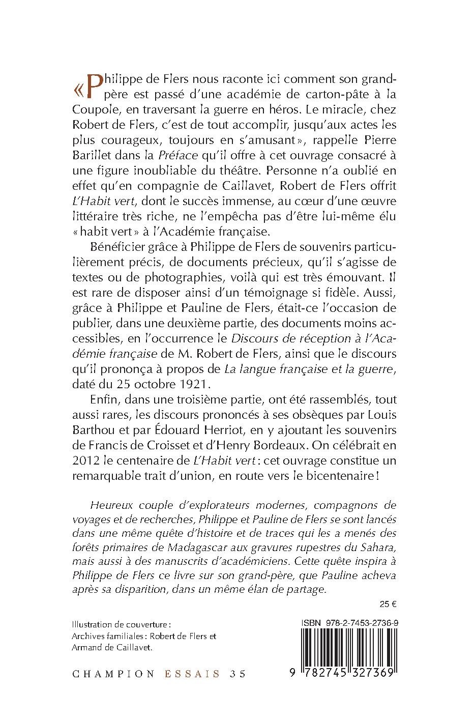 « Philippe de Flers nous raconte ici comment son grand-père est passé d’une académie de carton-pâte à la Coupole, en traversant la guerre en héros. Le miracle, chez Robert de Flers, c’est de tout accomplir, jusqu’aux actes les plus courageux, toujours en s’amusant », rappelle Pierre Barillet dans la Préface qu’il offre à cet ouvrage consacré à une figure inoubliable du théâtre. Personne n’a oublié en effet qu’en compagnie de Caillavet, Robert de Flers offrit L’Habit vert, dont le succès immense, au cœur d’une œuvre littéraire très riche, ne l’empêcha pas d’être lui-même élu «habit vert » à l’Académie française. Bénéficier grâce à Philippe de Flers de souvenirs particulièrement précis, de documents précieux, qu’il s’agisse de textes ou de photographies, voilà qui est très émouvant. Il est rare de disposer ainsi d’un témoignage si fidèle. Aussi, grâce à Philippe et Pauline de Flers, était-ce l’occasion de publier, dans une deuxième partie, des documents moins accessibles, en l’occurrence le Discours de réception à l'Académie française de M. Robert de Flers, ainsi que le discours qu’il prononça à propos de La langue française et la guerre, daté du 25 octobre 1921. Enfin, dans une troisième partie, ont été rassemblés, tout aussi rares, les discours prononcés à ses obsèques par Louis Barthou et par Édouard Herriot, en y ajoutant les souvenirs de Francis de Croisset et d’Henry Bordeaux. On célébrait en 2012 le centenaire de « L’Habit vert » : cet ouvrage constitue un remarquable trait d’union, en route vers le bicentenaire !