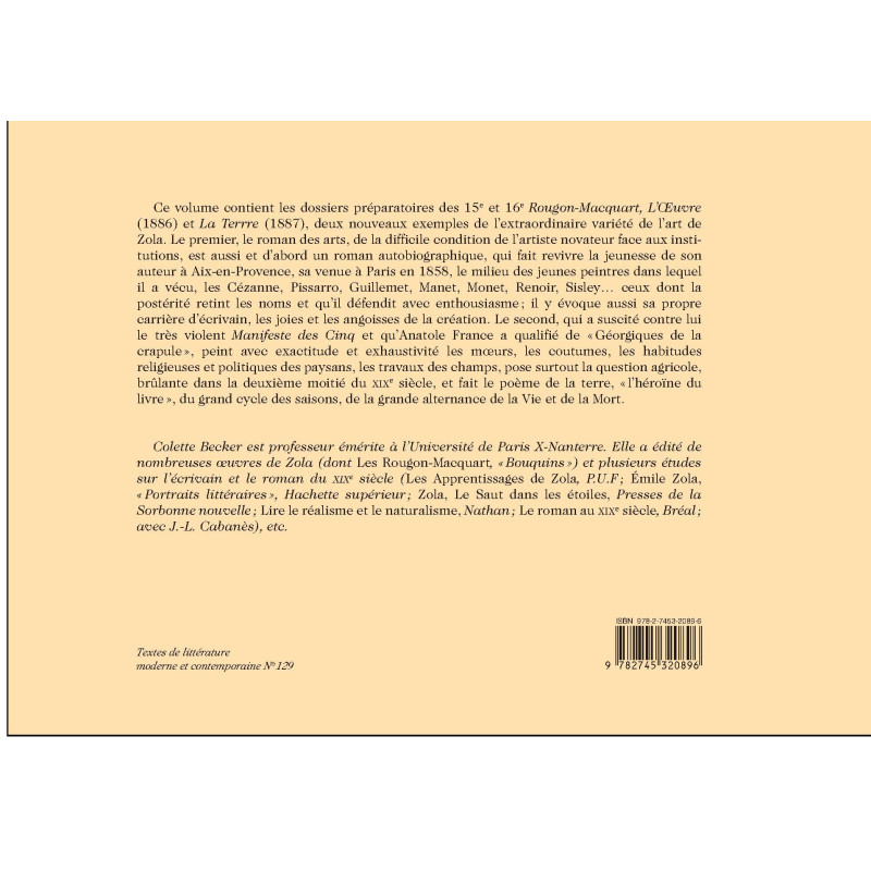 Ce volume contient les dossiers préparatoires des 15e et 16e Rougon-Macquart, L’Œuvre (1886) et La Terrre (1887), deux nouveaux exemples de l’extraordinaire variété de l’art de Zola. Le premier, le roman des arts, de la difficile condition de l’artiste novateur face aux institutions, est aussi et d’abord un roman autobiographique, qui fait revivre la jeunesse de son auteur à Aix-en-Provence, sa venue à Paris en 1858, le milieu des jeunes peintres dans lequel il a vécu, les Cézanne, Pissarro, Guillemet, Manet, Monet, Renoir, Sisley… ceux dont la postérité retint les noms et qu’il défendit avec enthousiasme ; il y évoque aussi sa propre carrière d’écrivain, les joies et les angoisses de la création. Le second, qui a suscité contre lui le très violent Manifeste des Cinq et qu’Anatole France a qualifié de «Géorgiques de la crapule », peint avec exactitude et exhaustivité les mœurs, les coutumes, les habitudes religieuses et politiques des paysans, les travaux des champs, pose surtout la question agricole, brûlante dans la deuxième moitié du XIXe siècle, et fait le poème de la terre, « l’héroïne du livre », du grand cycle des saisons, de la grande alternance de la Vie et de la Mort.