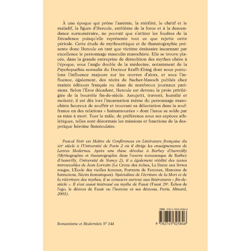 À une époque qui prône l’anémie, la stérilité, le chétif et le maladif, la figure d’Hercule, emblème de la force et à la descendance surnuméraire, ne pouvait que s’attirer les foudres de la Décadence puisqu’elle représente tout ce que rejette cette période. Cette étude de mythocritique et de thanatographie présente donc Hercule en tant que victime émissaire incarnant par excellence le personnage masculin masochiste. Elle se trouve placée, dans la grande entreprise de démolition des mythes chère à l`époque, sous l’angle double de la médecine, notamment de la Psychopathia sexualis du Docteur Krafft-Ebing dont nous postulons l’influence majeure sur les œuvres d’alors, et sous l’influence, également, des récits de Sacher-Masoch publiés chez maints éditeurs français ou dans de nombreux journaux parisiens. Selon l’Éros décadent, Hercule est devenu la proie privilégiée de la bourrèle fin-de-siècle. Assujetti, travesti, humilié et molesté, il est dès lors l’incarnation même du personnage masochiste heureux de souffrir et trouvant sa délectation dans la souffrance en des relations « hainamourées » dont l’issue se solde par sa mise à mort. Tuer le mâle, de préférence sous ses espèces athlétiques, telles sont désormais les missions et fonctions de la despotique héroïne finiséculaire.
