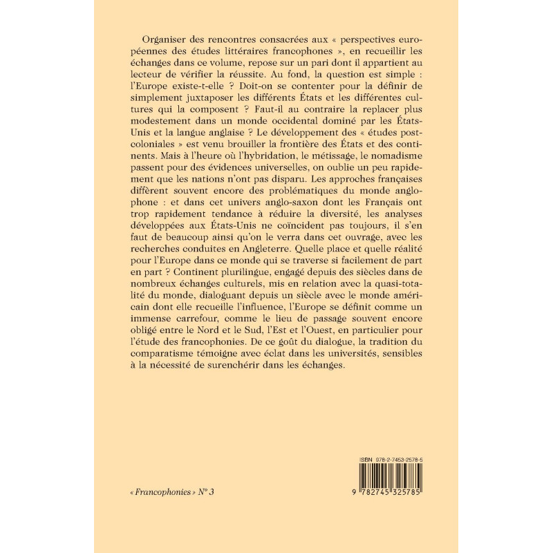 Organiser des rencontres consacrées aux « perspectives européennes des études littéraires francophones », en recueillir les échanges dans ce volume, repose sur un pari dont il appartient au lecteur de vérifier la réussite. Au fond, la question est simple : l’Europe existe-t-elle ? Doit-on se contenter pour la définir de simplement juxtaposer les différents États et les différentes cultures qui la composent ? Faut-il au contraire la replacer plus modestement dans un monde occidental dominé par les États-Unis et la langue anglaise ? Le développement des « études postcoloniales » est venu brouiller la frontière des États et des continents. Mais à l’heure où l’hybridation, le métissage, le nomadisme passent pour des évidences universelles, on oublie un peu rapidement que les nations n’ont pas disparu. Les approches françaises diffèrent souvent encore des problématiques du monde anglophone : et dans cet univers anglo-saxon dont les Français ont trop rapidement tendance à réduire la diversité, les analyses développées aux États-Unis ne coïncident pas toujours, il s’en faut de beaucoup ainsi qu’on le verra dans cet ouvrage, avec les recherches conduites en Angleterre. Quelle place et quelle réalité pour l’Europe dans ce monde qui se traverse si facilement de part en part ? Continent plurilingue, engagé depuis des siècles dans de nombreux échanges culturels, mis en relation avec la quasi-totalité du monde, dialoguant depuis un siècle avec le monde américain dont elle recueille l’influence, l’Europe se définit comme un immense carrefour, comme le lieu de passage souvent encore obligé entre le Nord et le Sud, l’Est et l’Ouest, en particulier pour l’étude des francophonies. De ce goût du dialogue, la tradition du comparatisme témoigne avec éclat dans les universités, sensibles à la nécessité de surenchérir dans les échanges.
