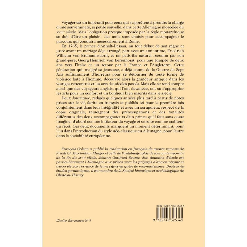 Deux Journaux, rédigés quelques années plus tard à partir de notes prises sur le vif, écrits en français et publiés ici pour la première fois conjointement dans leur intégralité et avec un scrupuleux respect de la copie originale, témoignent des préoccupations et des tonalités différentes des deux accompagnateurs d’un prince qu’il faut sans cesse imaginer d’abord comme initiateur du voyage et ensuite comme auditeur du récit. Ces deux documents marquent un moment déterminant, pour l’un dans l’introduction du style néo-classique en Allemagne, pour l’autre dans la sociabilité européenne.
