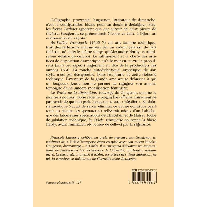 réédition de La Fidèle Tromperie étant couplée avec son récent Nicolas Gougenot, dramaturge… Au-delà, il a entrepris d’éclairer les inspirations de jeunesse et les résistances de Corneille, analysant, notamment, la pastorale anonyme d’Alidor, les pièces des Cinq auteurs…, et ici, la connivence méconnue de Corneille avec Gougenot.