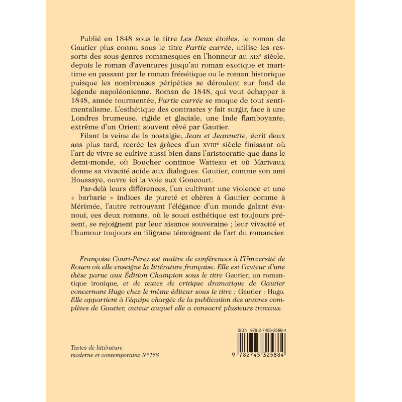 Françoise Court-Pérez est maître de conférences à l’Université de Rouen où elle enseigne la littérature française. Elle est l’auteur d’une thèse parue aux Édition Champion sous le titre Gautier, un romantique ironique, et de textes de critique dramatique de Gautier concernant Hugo chez le même éditeur sous le titre : Gautier : Hugo. Elle appartient à l’équipe chargée de la publication des oeuvres complètes de Gautier, auteur auquel elle a consacré plusieurs travaux.