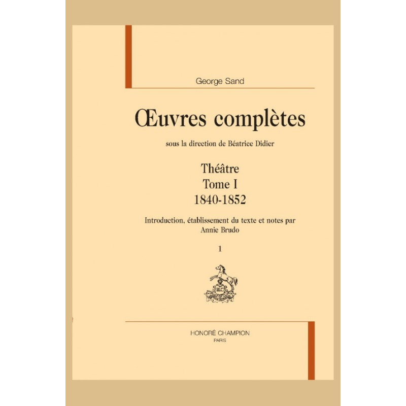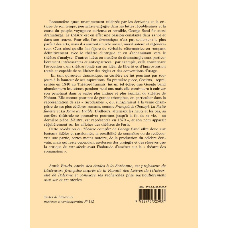 Romancière quasi unanimement célébrée par les écrivains et la critique de son temps, journaliste engagée dans les luttes républicaines et la cause du peuple, voyageuse curieuse et sensible, George Sand fut aussi dramaturge. Le théâtre est en effet une passion constante dans sa vie et dans son oeuvre. Pour elle, l’art dramatique n’est pas seulement le plus parfait des arts, mais il a surtout un rôle social, moralisateur et régénérateur. C’est ainsi qu’elle fait figure de véritable réformatrice en rompant définitivement avec le théâtre d’intrigue et en s’acheminant vers le théâtre d’analyse. D’autres idées en matière de dramaturgie sont particulièrement intéressantes et anticipatrices : par exemple, celle concernant l’évocation d’un théâtre fondé sur un idéal de liberté et d’improvisation otale et capable de se libérer des règles et des conventions d’usage. En tant qu’auteur dramatique, sa carrière ne fut pourtant pas toujours à la hauteur de ses aspirations. Sa première pièce, Cosima, représentée en 1840 au Théâtre-Français, fut un tel échec que George Sand abandonnera les scènes pendant neuf ans mais elle continuera à cultiver son penchant dans le cadre plus intime et plus familial du théâtre de Nohant. Elle connut pourtant de grands triomphes, en particulier dans la représentation de ses « rurodrames », qui s’inspiraient à la veine champêtre de ses plus célèbres romans, comme François le Champi, La Petite fadette et La Mare au Diable. D’ailleurs, alternant les hauts et les bas, sa carrière théâtrale se poursuivra pourtant jusqu’à la fin de sa vie, – sa dernière pièce, L’Autre, est représentée en 1870 –, et son nom apparaît régulièrement sur les affiches des théâtres de Paris. Cette ré-édition du Théâtre complet de George Sand offre donc aux lecteurs fidèles et passionnés, la possibilité de connaître ou de redécouvrir une partie, certes moins notoire, de la production du célèbre écrivain, mais qui reste cependant au-dessus des préjugés et des réserves que la critique du XIXe siècle avait l’habitude d’asséner sur le « théâtre des romanciers ».