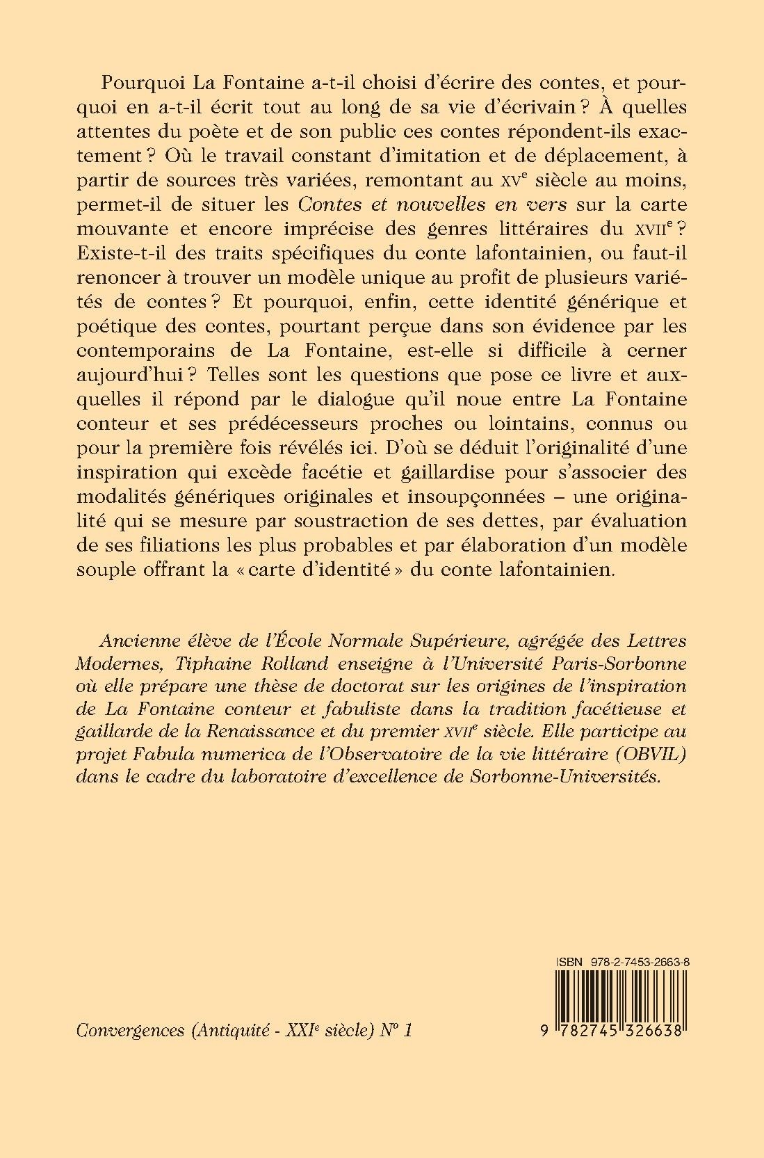 aujourd’hui ? Telles sont les questions que pose ce livre et auxquelles il répond par le dialogue qu’il noue entre La Fontaine conteur et ses prédécesseurs proches ou lointains, connus ou pour la première fois révélés ici. D’où se déduit l’originalité d’une inspiration qui excède facétie et gaillardise pour s’associer des modalités génériques originales et insoupçonnées – une originalité qui se mesure par soustraction de ses dettes, par évaluation de ses filiations les plus probables et par élaboration d’un modèle souple offrant la « carte d’identité » du conte lafontainien.