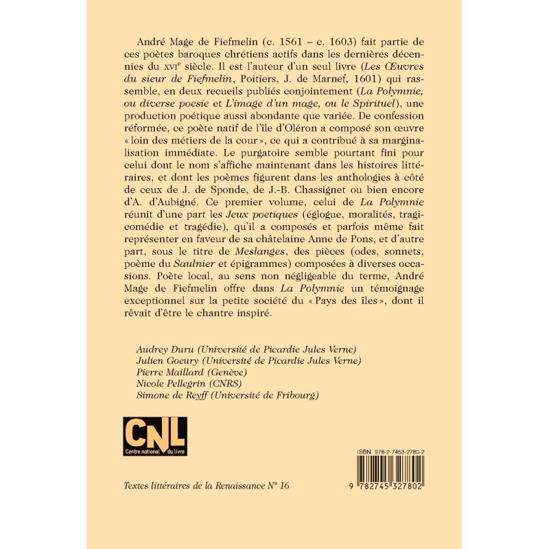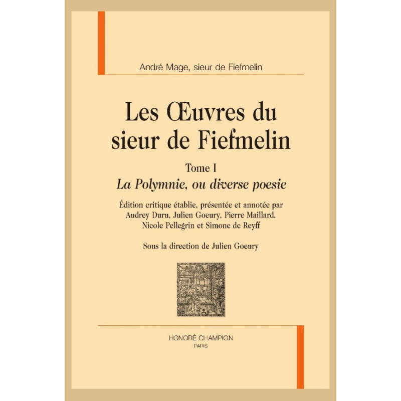 André Mage de Fiefmelin (c. 1561 – c. 1603) fait partie de ces poètes baroques chrétiens actifs dans les dernières décennies du XVIe siècle. Il est l’auteur d’un seul livre (Les OEuvres du sieur de Fiefmelin, Poitiers, J. de Marnef, 1601) qui rassemble, en deux recueils publiés conjointement (La Polymnie, ou diverse poesie et L’image d’un mage, ou le Spirituel), une production poétique aussi abondante que variée. De confession réformée, ce poète natif de l’île d’Oléron a composé son oeuvre « loin des métiers de la cour », ce qui a contribué à sa marginalisation immédiate. Le purgatoire semble pourtant fini pour celui dont le nom s’affiche maintenant dans les histoires littéraires, et dont les poèmes figurent dans les anthologies à côté de ceux de J. de Sponde, de J.-B. Chassignet ou bien encore d’A. d’Aubigné. Ce premier volume, celui de La Polymnie réunit d’une part les Jeux poetiques (églogue, moralités, tragicomédie et tragédie), qu’il a composés et parfois même fait représenter en faveur de sa châtelaine Anne de Pons, et d’autre part, sous le titre de Meslanges, des pièces (odes, sonnets, poème du Saulnier et épigrammes) composées à diverses occasions. Poète local, au sens non négligeable du terme, André Mage de Fiefmelin offre dans La Polymnie un témoignage exceptionnel sur la petite société du « Pays des îles », dont il rêvait d’être le chantre inspiré.