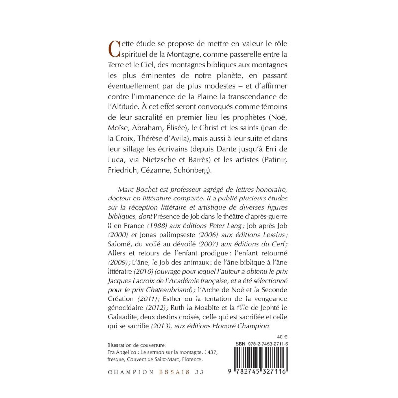Cette étude se propose de mettre en valeur le rôle spirituel de la Montagne, comme passerelle entre la Terre et le Ciel, des montagnes bibliques aux montagnes les plus éminentes de notre planète, en passant éventuellement par de plus modestes – et d’affirmer contre l’immanence de la Plaine la transcendance de l’Altitude. À cet effet seront convoqués comme témoins de leur sacralité en premier lieu les prophètes (Noé, Moïse, Abraham, Élisée), le Christ et les saints (Jean de la Croix, Thérèse d’Avila), mais aussi à leur suite et dans leur sillage les écrivains (depuis Dante jusqu’à Erri de Luca, via Nietzsche et Barrès) et les artistes (Patinir, Friedrich, Cézanne, Schönberg).