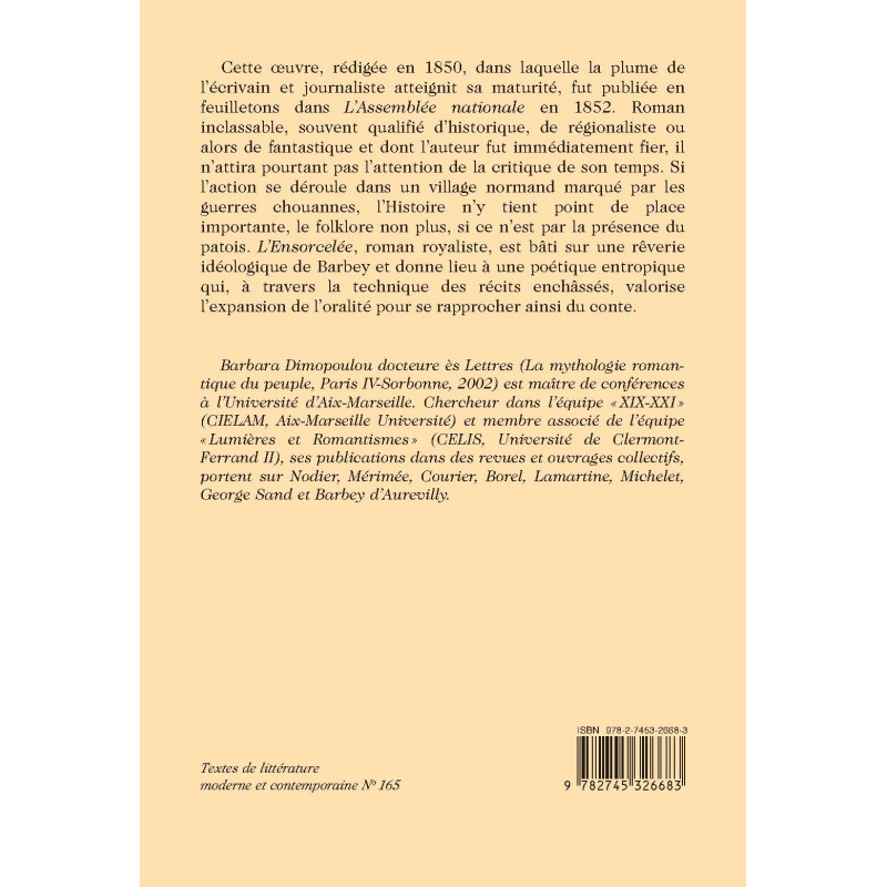 feuilletons dans L’Assemblée nationale en 1852. Roman inclassable, souvent qualifié d’historique, de régionaliste ou alors de fantastique et dont l’auteur fut immédiatement fier, il n’attira pourtant pas l’attention de la critique de son temps. Si l’action se déroule dans un village normand marqué par les guerres chouannes, l’Histoire n’y tient point de place importante, le folklore non plus, si ce n’est par la présence du patois. L’Ensorcelée, roman royaliste, est bâti sur une rêverie idéologique de Barbey et donne lieu à une poétique entropique qui, à travers la technique des récits enchâssés, valorise l’expansion de l’oralité pour se rapprocher ainsi du conte.