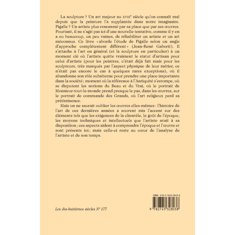 Pigalle ? Un artiste plus renommé par sa place que par ses oeuvres. Pourtant, il ne s’agit pas ici d’une nouvelle tentative, comme il y en a eu beaucoup, un peu vaines, de réhabiliter un artiste et un art méconnus. Ce livre « aborde l’étude de Pigalle selon un angle d’approche complètement différent » (Jean-René Gaborit). Il s’attache à l’art en général (et la sculpture en particulier) à un moment clé où l’artiste quitte vraiment le statut d’artisan pour celui d’artiste (pour les peintres, c’était déjà fait mais pour les sculpteurs, très marqués par l’aspect physique de leur métier, ce n’était pas encore le cas à quelques rares exceptions), où il abandonne son rôle subalterne pour prendre une place importante dans la société ; moment où la référence à l’Antiquité s’estompe, où se disputent les notions du Beau et du Vrai, où le portrait de Monsieur-tout-le-monde prend presque le pas, dans les oeuvres, sur le portrait de commande des Grands, où l’art religieux perd sa prééminence.