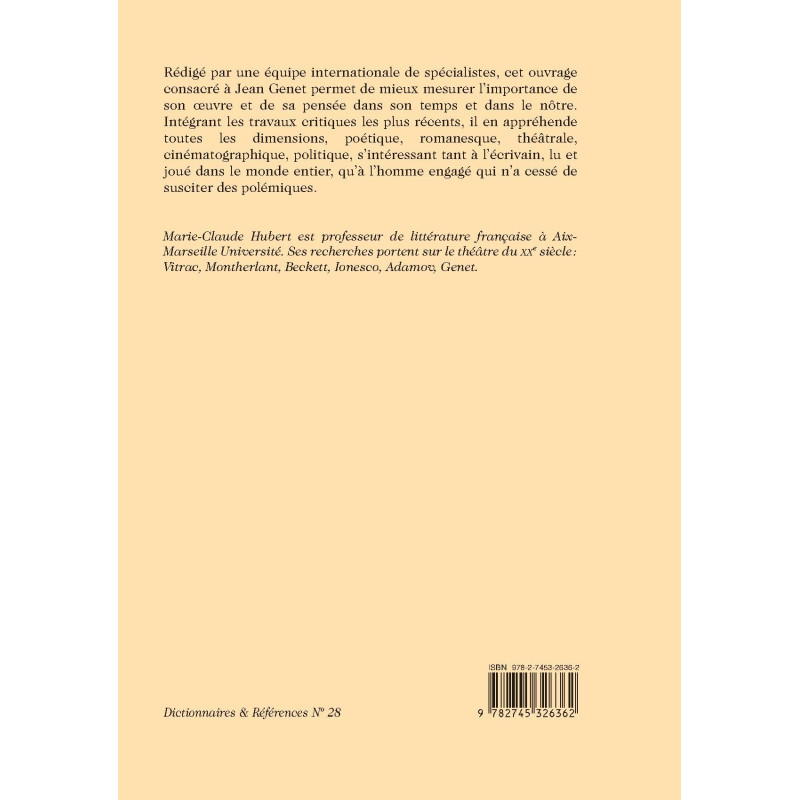 Rédigé par une équipe internationale de spécialistes, cet ouvrage consacré à Jean Genet permet de mieux mesurer l’importance de son oeuvre et de sa pensée dans son temps et dans le nôtre. Intégrant les travaux critiques les plus récents, il en appréhende toutes les dimensions, poétique, romanesque, théâtrale, cinématographique, politique, s’intéressant tant à l’écrivain, lu et joué dans le monde entier, qu’à l’homme engagé qui n’a cessé de susciter des polémiques.