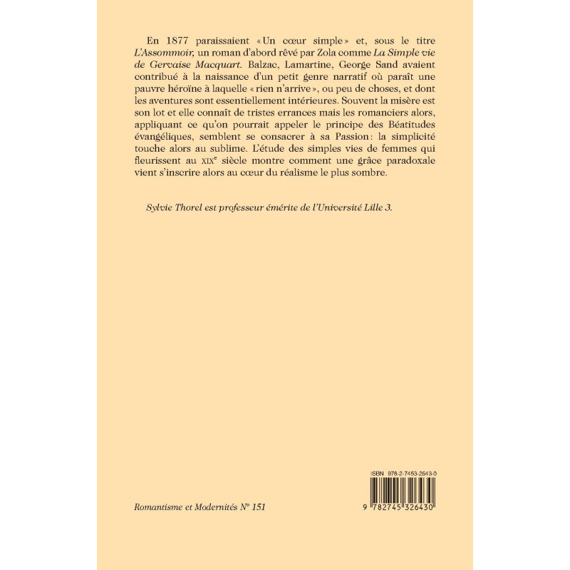 pauvre héroïne à laquelle « rien n’arrive », ou peu de choses, et dont les aventures sont essentiellement intérieures. Souvent la misère est son lot et elle connaît de tristes errances mais les romanciers alors, appliquant ce qu’on pourrait appeler le principe des Béatitudes évangéliques, semblent se consacrer à sa Passion: la simplicité touche alors au sublime. L’étude des simples vies de femmes qui fleurissent au XIXe siècle montre comment une grâce paradoxale vient s’inscrire alors au coeur du réalisme le plus sombre.