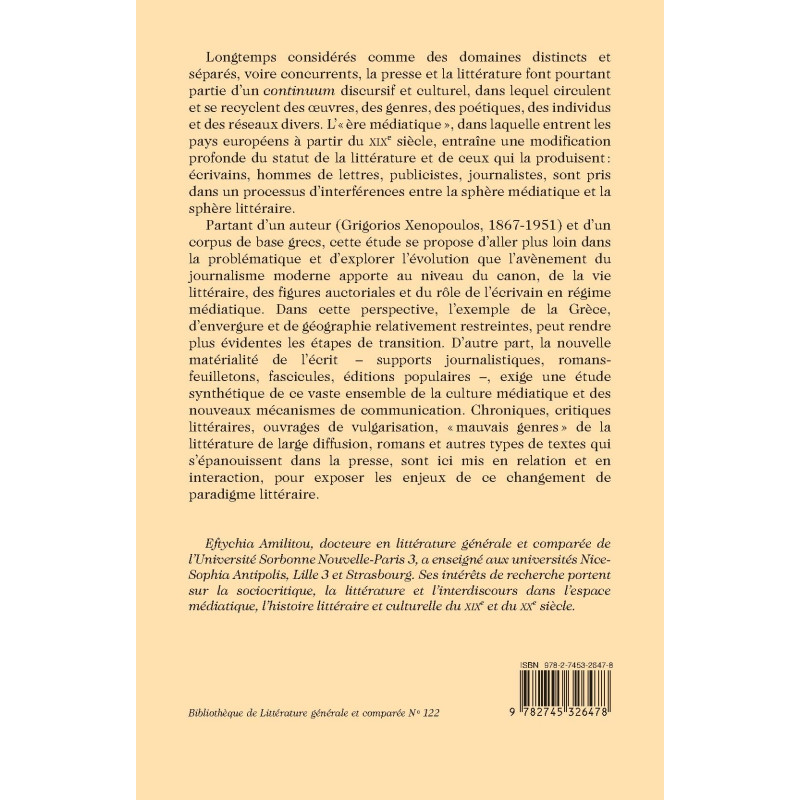 journalisme moderne apporte au niveau du canon, de la vie littéraire, des figures auctoriales et du rôle de l’écrivain en régime médiatique. Dans cette perspective, l’exemple de la Grèce, d’envergure et de géographie relativement restreintes, peut rendre plus évidentes les étapes de transition. D’autre part, la nouvelle matérialité de l’écrit – supports journalistiques, romansfeuilletons, fascicules, éditions populaires –, exige une étude synthétique de ce vaste ensemble de la culture médiatique et des nouveaux mécanismes de communication. Chroniques, critiques littéraires, ouvrages de vulgarisation, «mauvais genres » de la littérature de large diffusion, romans et autres types de textes qui s’épanouissent dans la presse, sont ici mis en relation et en interaction, pour exposer les enjeux de ce changement de paradigme littéraire.