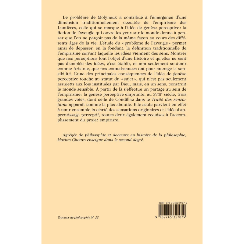 l’empirisme : la genèse perceptive emprunte, au XVIIIe siècle, trois grandes voies, dont celle de Condillac dans le Traité des sensations apparaît comme la plus aboutie. Elle seule parvient en effet à tenir ensemble la clarté des sensations originaires et l’idée d’apprentissage perceptif, toutes deux également requises à l’accomplissement du projet empiriste.