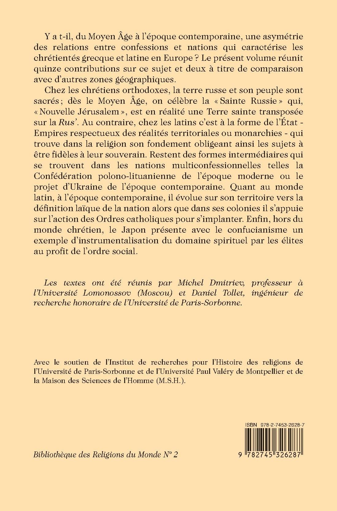 Y a t-il, du Moyen Âge à l’époque contemporaine, une asymétrie des relations entre confessions et nations qui caractérise les chrétientés grecque et latine en Europe? Le présent volume réunit quinze contributions sur ce sujet et deux à titre de comparaison avec d’autres zones géographiques.