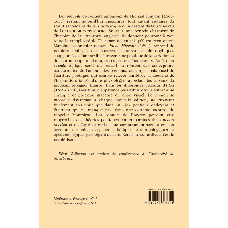 statut secondaire de leur auteur que d’un certain dédain vis-à-vis de la tradition pétrarquiste. Situés à une période charnière de l’histoire de la littérature anglaise, ils donnent pourtant à voir toute la complexité de l’héritage italien tel qu’il est reçu outre-Manche. Le premier recueil, Ideas Mirrour (1594), reprend de manière ambiguë des sources littéraires et philosophiques soupçonnées d’immoralité à travers une poétique de la variation et de l’outrance qui tend à saper ses propres fondements. Au fil d’un tissage topique serré du recueil s’affrontent des conceptions concurrentes de l’amour, des passions, du corps, mais aussi de l’écriture poétique, qui semble relever tantôt de la doctrine de l’inspiration, tantôt d’une physiologie rappellant les travaux du médecin espagnol Huarte. Dans les différentes versions d’Idea (1599-1619), l’écriture, d’apparence plus sobre, oscille entre veine comique et poétique macabre du choc visuel. Le recueil se morcelle davantage à chaque nouvelle édition, ne trouvant finalement son unité que dans un « je » poétique ondoyant et fluctuant qui ne manque pas, dans une certaine mesure, de rappeler Montaigne. Les sonnets de Drayton peuvent être rapprochés des théories poétiques contemporaines du concetto poetico et du Caprice ; mais ils se comprennent surtout en lien avec un ensemble d’aspects esthétiques, anthropologiques et épistémologiques participant de cette Renaissance tardive qu’est le maniérisme.