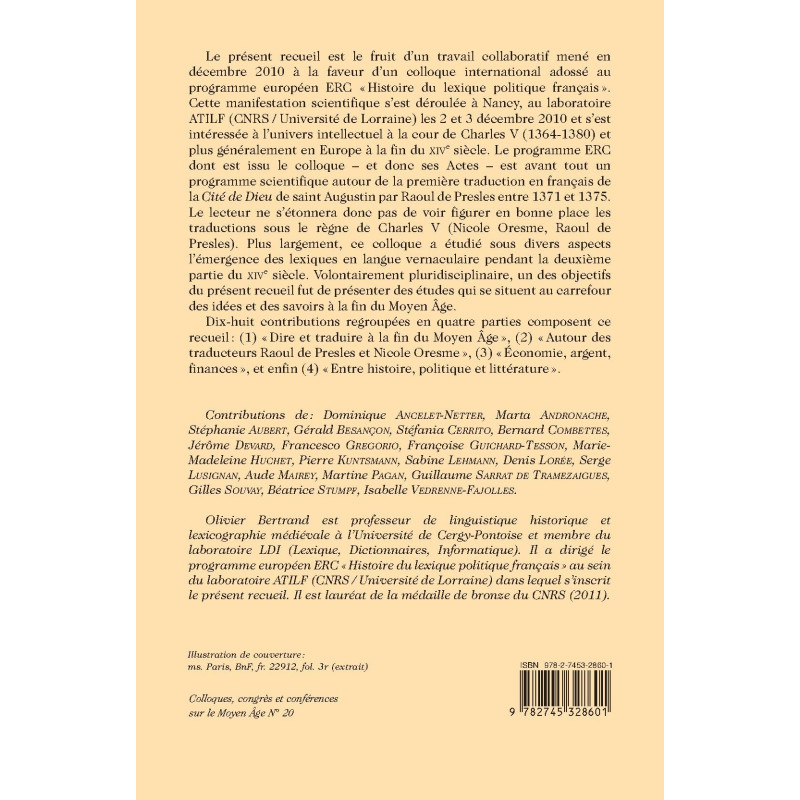 traductions sous le règne de Charles V (Nicole Oresme, Raoul de Presles). Plus largement, ce colloque a étudié sous divers aspects l’émergence des lexiques en langue vernaculaire pendant la deuxième partie du XIVe siècle. Volontairement pluridisciplinaire, un des objectifs du présent recueil fut de présenter des études qui se situent au carrefour des idées et des savoirs à la fin du Moyen Âge.