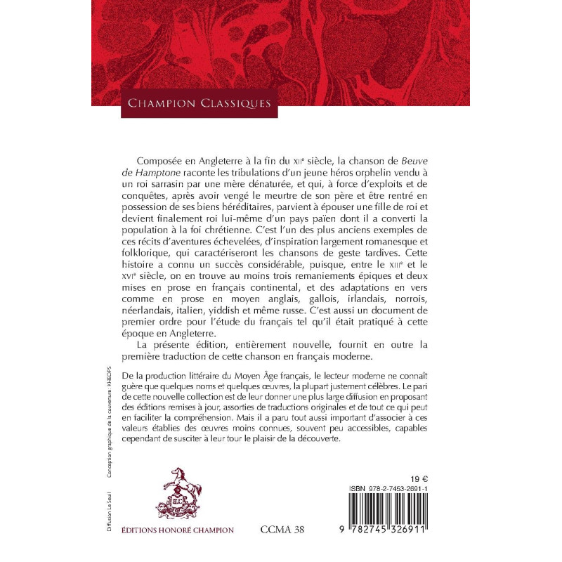 Composée en Angleterre à la fin du XIIe siècle, la chanson de Beuve de Hamptone raconte les tribulations d’un jeune héros orphelin vendu à un roi sarrasin par une mère dénaturée, et qui, à force d’exploits et de conquêtes, après avoir vengé le meurtre de son père et être rentré en possession de ses biens héréditaires, parvient à épouser une fille de roi et devient finalement roi lui-même d’un pays païen dont il a converti la population à la foi chrétienne. C’est l’un des plus anciens exemples de ces récits d’aventures échevelées, d’inspiration largement romanesque et folklorique, qui caractériseront les chansons de geste tardives. Cette histoire a connu un succès considérable, puisque, entre le XIIIe et le XVIe siècle, on en trouve au moins trois remaniements épiques et deux mises en prose en français continental, et des adaptations en vers comme en prose en moyen anglais, gallois, irlandais, norrois, néerlandais, italien, yiddish et même russe. C’est aussi un document de premier ordre pour l’étude du français tel qu’il était pratiqué à cette époque en Angleterre.