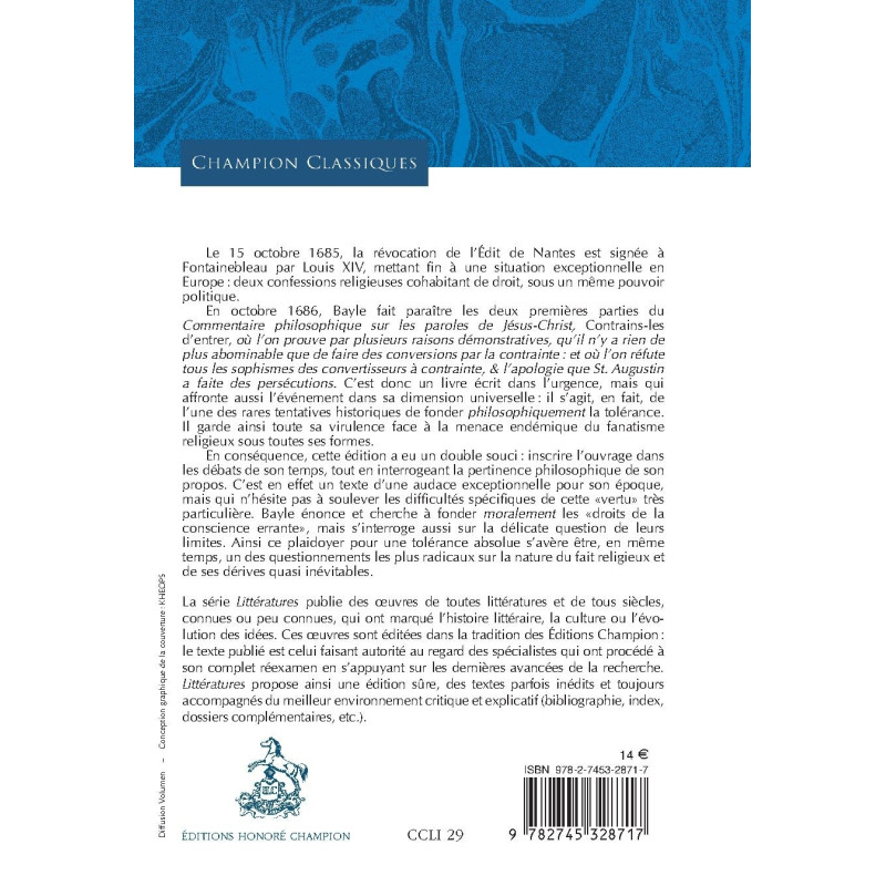 En conséquence, cette édition a eu un double souci : inscrire l’ouvrage dans les débats de son temps, tout en interrogeant la pertinence philosophique de son propos. C’est en effet un texte d’une audace exceptionnelle pour son époque, mais qui n’hésite pas à soulever les difficultés spécifiques de cette «vertu» très particulière. Bayle énonce et cherche à fonder moralement les «droits de la conscience errante», mais s’interroge aussi sur la délicate question de leurs limites. Ainsi ce plaidoyer pour une tolérance absolue s’avère être, en même temps, un des questionnements les plus radicaux sur la nature du fait religieux et de ses dérives quasi inévitables.