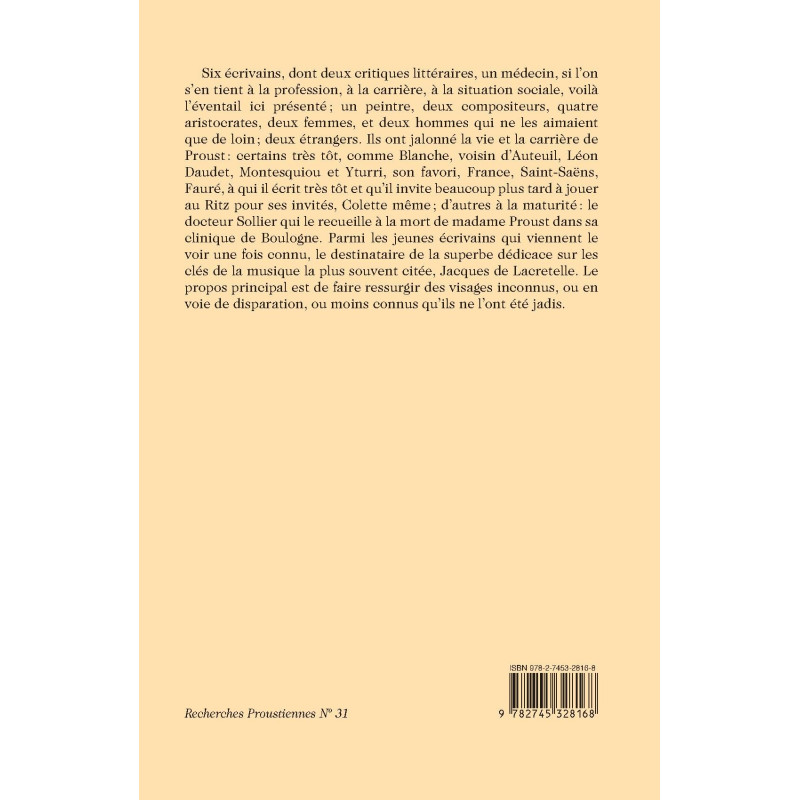 Six écrivains, dont deux critiques littéraires, un médecin, si l’on s’en tient à la profession, à la carrière, à la situation sociale, voilà l’éventail ici présenté ; un peintre, deux compositeurs, quatre aristocrates, deux femmes, et deux hommes qui ne les aimaient que de loin ; deux étrangers. Ils ont jalonné la vie et la carrière de Proust : certains très tôt, comme Blanche, voisin d’Auteuil, Léon Daudet, Montesquiou et Yturri, son favori, France, Saint-Saëns, Fauré, à qui il écrit très tôt et qu’il invite beaucoup plus tard à jouer au Ritz pour ses invités, Colette même ; d’autres à la maturité : le docteur Sollier qui le recueille à la mort de madame Proust dans sa clinique de Boulogne. Parmi les jeunes écrivains qui viennent le voir une fois connu, le destinataire de la superbe dédicace sur les clés de la musique la plus souvent citée, Jacques de Lacretelle. Le propos principal est de faire ressurgir des visages inconnus, ou en voie de disparation, ou moins connus qu’ils ne l’ont été jadis.