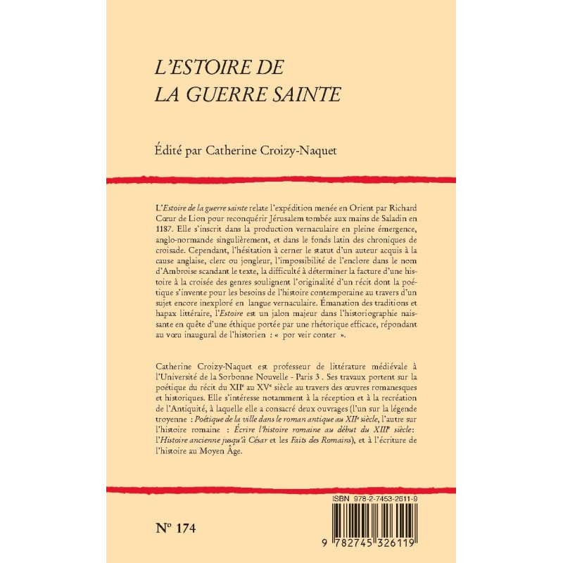 L’Estoire de la guerre sainte relate l’expédition menée en Orient par Richard Coeur de Lion pour reconquérir Jérusalem tombée aux mains de Saladin en 1187. Elle s’inscrit dans la production vernaculaire en pleine émergence, anglo-normande singulièrement, et dans le fonds latin des chroniques de croisade. Cependant, l’hésitation à cerner le statut d’un auteur acquis à la cause anglaise, clerc ou jongleur, l’impossibilité de l’enclore dans le nom d’Ambroise scandant le texte, la difficulté à déterminer la facture d’une histoire à la croisée des genres soulignent l’originalité d’un récit dont la poétique s’invente pour les besoins de l’histoire contemporaine au travers d’un sujet encore inexploré en langue vernaculaire. Émanation des traditions et hapax littéraire, l’Estoire est un jalon majeur dans l’historiographie naissante en quête d’une éthique portée par une rhétorique efficace, répondant au voeu inaugural de l’historien : « por veir conter ».