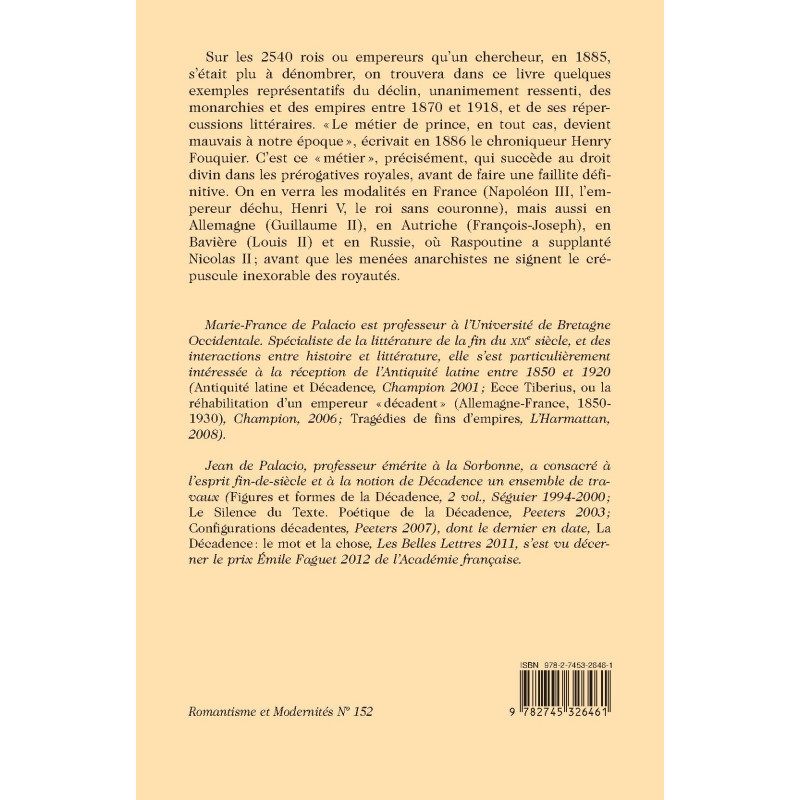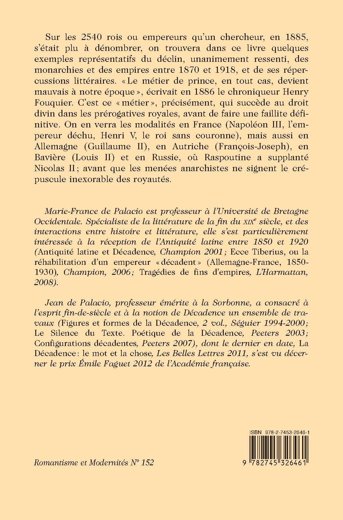 monarchies et des empires entre 1870 et 1918, et de ses répercussions littéraires. «Le métier de prince, en tout cas, devient mauvais à notre époque », écrivait en 1886 le chroniqueur Henry Fouquier. C’est ce «métier », précisément, qui succède au droit divin dans les prérogatives royales, avant de faire une faillite définitive. On en verra les modalités en France (Napoléon III, l’empereur déchu, Henri V, le roi sans couronne), mais aussi en Allemagne (Guillaume II), en Autriche (François-Joseph), en Bavière (Louis II) et en Russie, où Raspoutine a supplanté Nicolas II ; avant que les menées anarchistes ne signent le crépuscule inexorable des royautés.