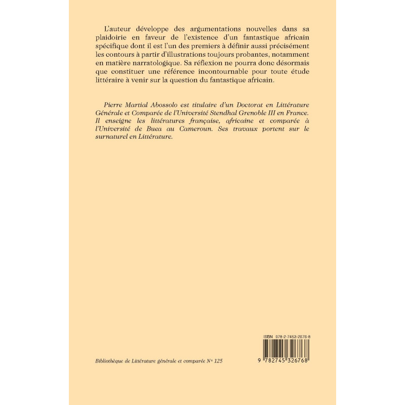 Pierre Martial Abossolo est titulaire d’un Doctorat en Littérature Générale et Comparée de l’Université Stendhal Grenoble III en France. Il enseigne les littératures française, africaine et comparée à l’Université de Buea au Cameroun. Ses travaux portent sur le surnaturel en Littérature.