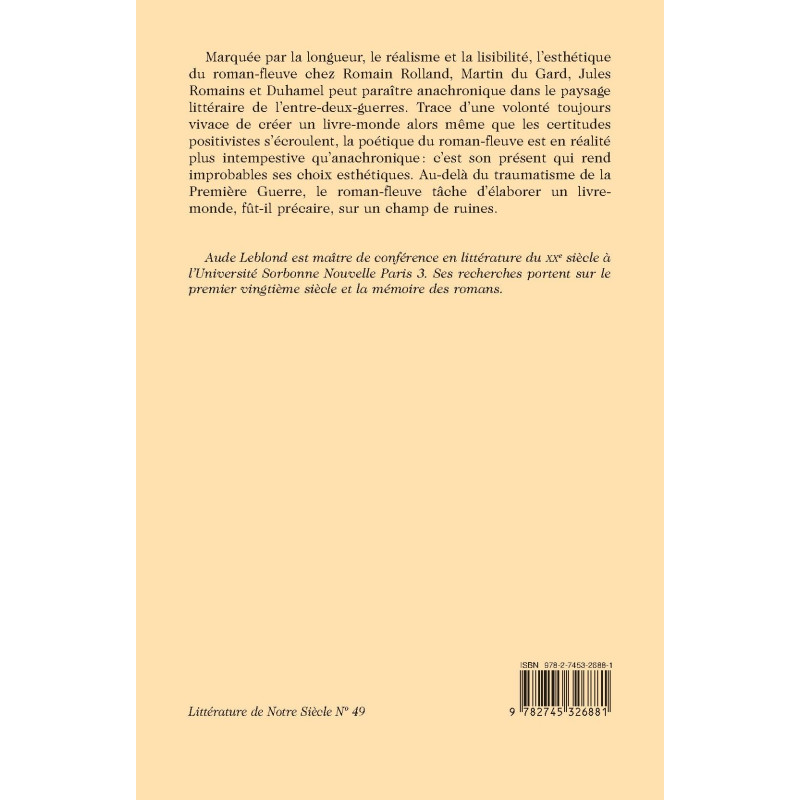 Marquée par la longueur, le réalisme et la lisibilité, l’esthétique du roman-fleuve chez Romain Rolland, Martin du Gard, Jules Romains et Duhamel peut paraître anachronique dans le paysage littéraire de l’entre-deux-guerres. Trace d’une volonté toujours vivace de créer un livre-monde alors même que les certitudes positivistes s’écroulent, la poétique du roman-fleuve est en réalité plus intempestive qu’anachronique : c’est son présent qui rend improbables ses choix esthétiques. Au-delà du traumatisme de la Première Guerre, le roman-fleuve tâche d’élaborer un livremonde, fût-il précaire, sur un champ de ruines.