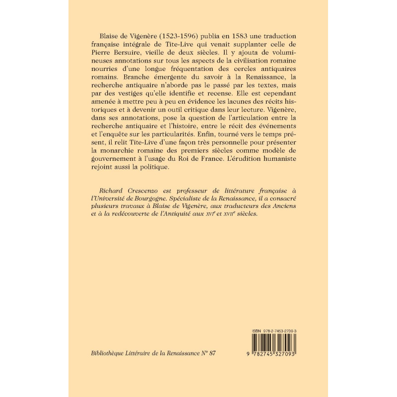 Pierre Bersuire, vieille de deux siècles. Il y ajouta de volumineuses annotations sur tous les aspects de la civilisation romaine nourries d’une longue fréquentation des cercles antiquaires romains. Branche émergente du savoir à la Renaissance, la recherche antiquaire n’aborde pas le passé par les textes, mais par des vestiges qu’elle identifie et recense. Elle est cependant amenée à mettre peu à peu en évidence les lacunes des récits historiques et à devenir un outil critique dans leur lecture. Vigenère, dans ses annotations, pose la question de l’articulation entre la recherche antiquaire et l’histoire, entre le récit des événements et l’enquête sur les particularités. Enfin, tourné vers le temps présent, il relit Tite-Live d’une façon très personnelle pour présenter la monarchie romaine des premiers siècles comme modèle de gouvernement à l’usage du Roi de France. L’érudition humaniste rejoint aussi la politique.