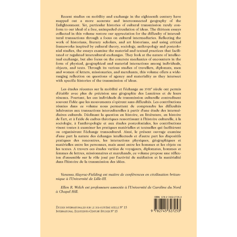 Les études récentes sur la mobilité et l’échange au XVIIIe siècle ont permis d’établir avec plus de précision une géographie des Lumières et de leurs réseaux. Pourtant, les cas individuels de transmission culturelle contredisent souvent l’idée que les mouvements s’opèrent sans difficultés. Les contributions réunies dans ce volume nous permettent de comprendre les difficultés inhérentes aux transactions interculturelles à partir d’une étude des intermédiaires culturels. Déclinant la question en histoire, en littérature, en histoire de l’art, et à l’aide de cadres théoriques ressortissant à l’histoire culturelle, à la sociologie, à l’anthropologie et aux études postcoloniales, les contributions visent toutes à examiner les pratiques matérielles et textuelles qui facilitèrent ou organisèrent l’échange transculturel. Ainsi, le présent ouvrage examine d’une part la nature des échanges intellectuels et d’autre part les dispositifs pratiques des rencontres, les interactions physiques, géographiques et matérielles entre les personnes, mais aussi entre les hommes et les objets ou les textes. A travers ces études variées de voyageurs, diplomates, hommes et femmes de lettres, missionnaires et marchands, ce volume propose une réflexion d’ensemble sur le rôle joué par l’activité de médiation et la matérialité dans l’histoire de la transmission des idées.